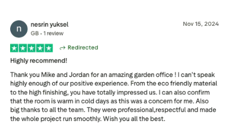 Once your design is agreed, we carry out a free site survey and arrange material delivery before starting the build. From the start of construction on site, most garden rooms are completed within around two weeks, with minimal disruption to your garden and neighbours.